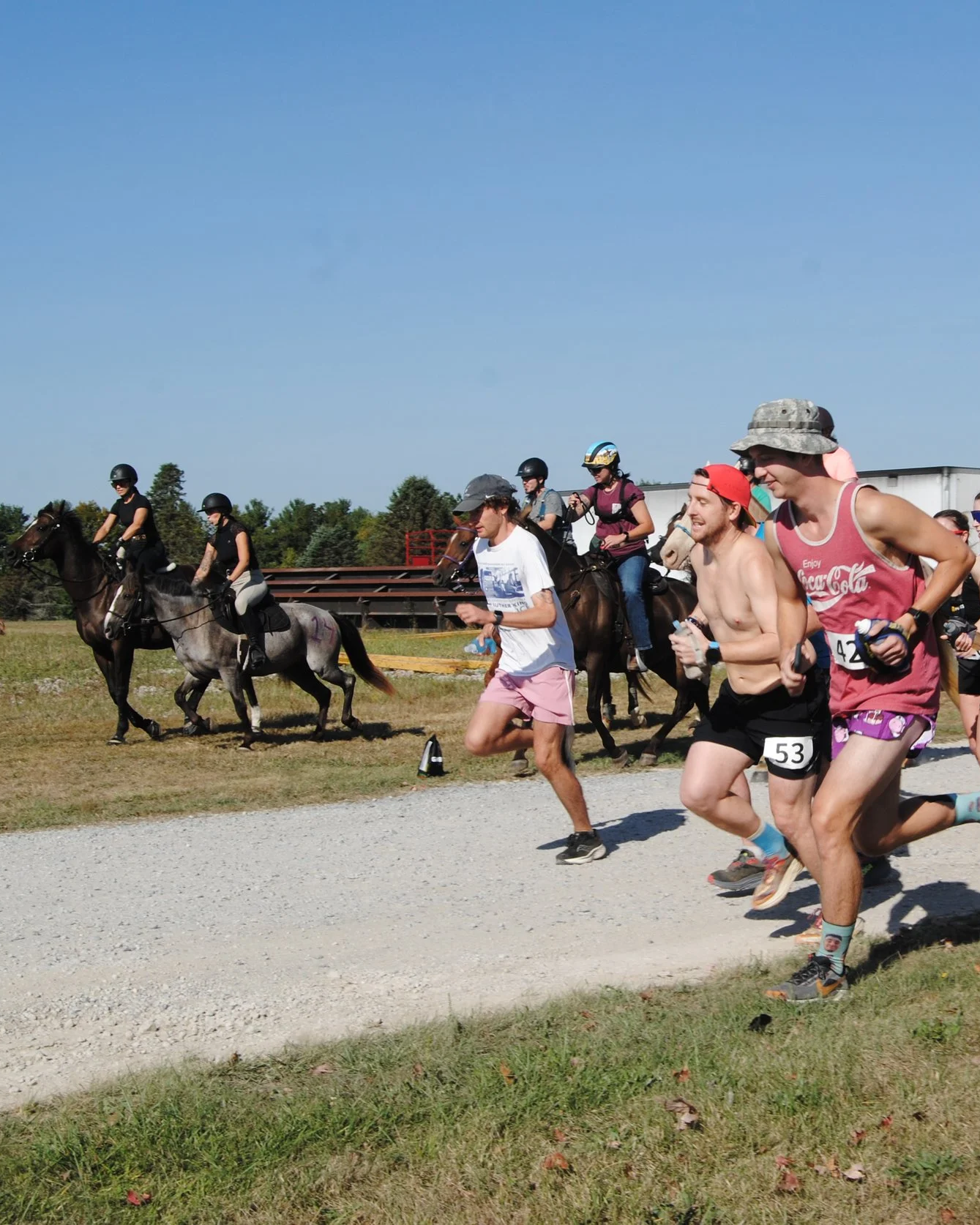 Runners compete against riders on horseback to see who can conquer a mixed-terrain course the fastest.
